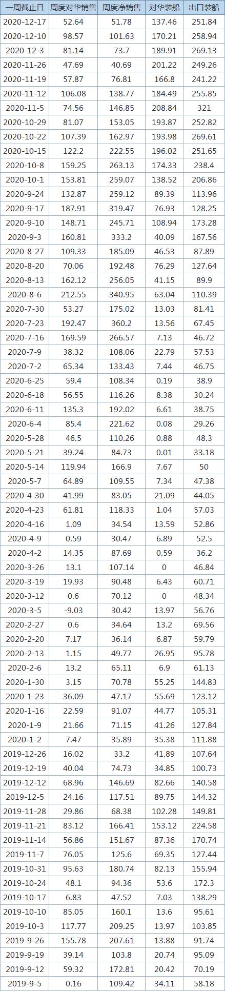 以下为2019/20年度以来USDA大豆周度对华出口销售数据统计(单位:万吨):