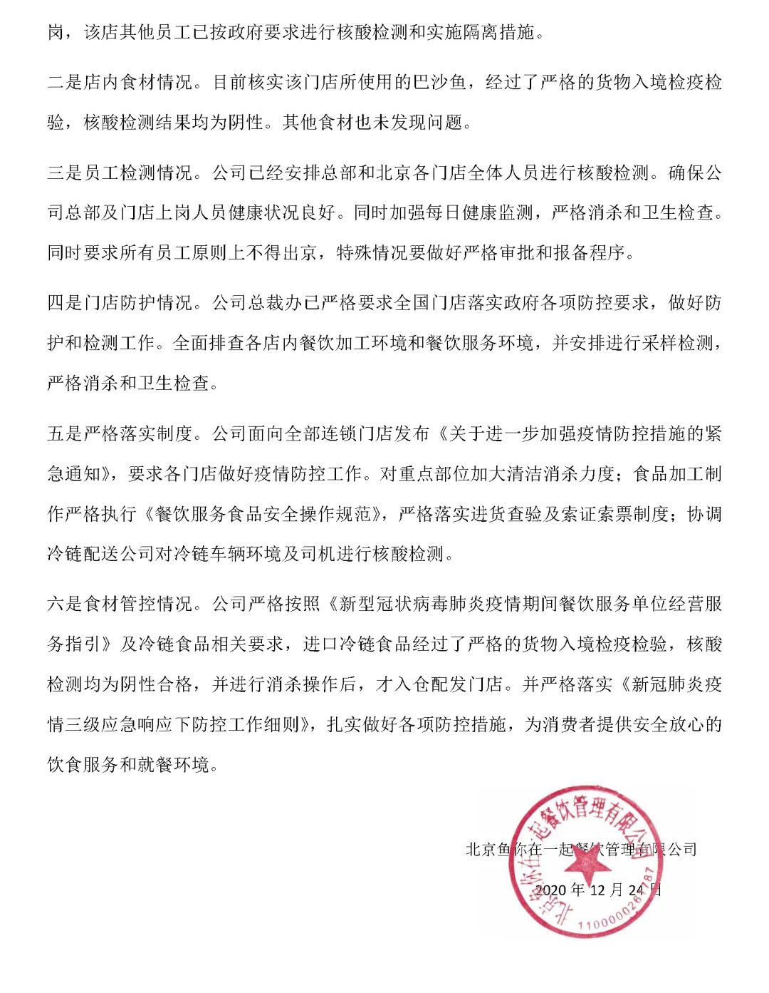 12月24日晚,北京鱼你在一起餐饮管理有限公司通过其官方微信公众号发布声明,称涉事门店为加盟店,公司在12月23日晚已经启动了疫情防控应急预案。叶某为新入职该门店两周的员工,该店其他员工已经按照政府要求进行核酸检测和实施隔离措施。