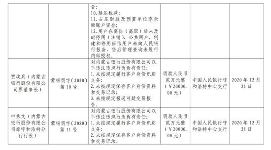 内蒙古银行股份有限公司原董事长贾埃兵对上述行为负责,被处罚款2万元。内蒙古银行股份有限公司原呼和浩特分行行长申秀文对上述行为负责,被处罚款2万元。