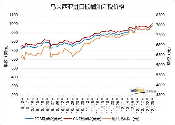 12月25日马来西亚棕榈油离岸价为980美元,较上日涨15美元,进口到岸价为1007美元,较上日涨15美元,进口成本价为7896.21元,较上日涨99.04元,连续第三日上涨。马来西亚BMD毛棕榈油期货周四收升1%,追随大商所及CBOT市场相关油脂品种升势,市场仍担心阿根廷油籽工人罢工导致该国供应紧张。