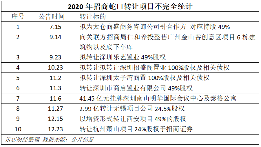 仅在今年下半年,招商蛇口转让资产达10项,包括深圳招盛阁置业100%股权、广州金山谷创意项目6栋建筑物及地下车位、深圳乐艺置业49%股权、深圳太子湾置业100%股权、武汉招盈汉都置业30%股权等。