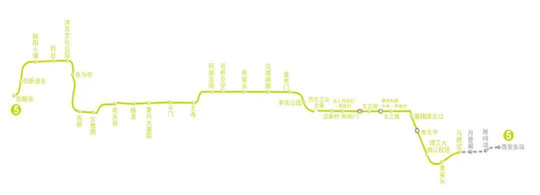 5号线是西安市轨道交通线网中第二条东西走向的主骨架线路,该线路西起创新港,东至西安东站,全长45.26公里,共计车站34座。受国铁西安东站建设整体方案影响,先期计划开通马腾空站至创新港站,含车站31座,共计41.6公里。一期贯穿主城区并连接西咸新区,沿线分布着多所高等院校、科研机构,同时分布有唐长安西市遗址、小雁塔、唐长安城遗址、青龙寺等,是一条既串联了核心科教文化,又能反映大唐盛景的地铁线路。二期横贯西咸新区沣东新城、沣西新城,线路以高架为主, 连接交大创新港、西工大翱翔小镇、西咸国际文化教育园、丝绸之路风情城、欢乐谷等一批重大项目,有力支撑了西咸新区新兴产业聚集,对推进新区高质量发展,加快西咸一体化进程具有积极作用。
