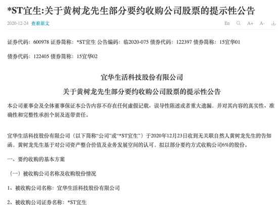 12月23日晚间,*ST宜生(600978.SH)公告称,公司当日收到无关联自然人黄树龙的告知函,黄树龙基于对公司资产整合价值及业务发展空间的认可,拟以部分要约方式收购公司6%的股份。本次要约收购的要约价格为1.15元/股,预计本次要约收购所需最高资金总额为1.02亿元。