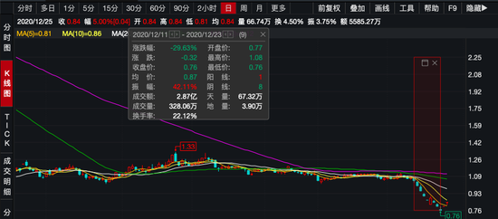 12月16日,*ST宜生发布重大事项的提示性公告,称截至2020年12月15日,公司股票收盘价为0.95元/股,已低于公司股票面值。*ST宜生提示称,根据《上海证券交易所股票上市规则》第14.3.1条之(五)款的规定,如果公司股票连续20个交易日(不包含公司股票停牌日)的每日股票收盘价均低于股票面值,公司股票将被终止上市。