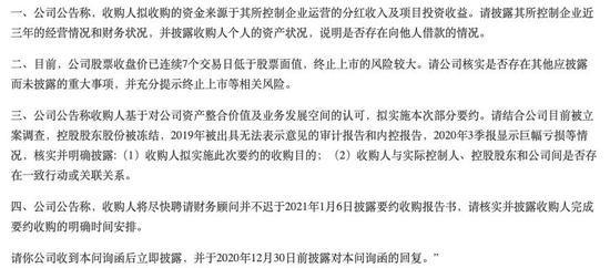上述公告发布后,上交所随即针对此项要约下发关注函,要求公司核实并补充披露如下事项,并要求公司于2020年12月30日前披露对本问询函的回复。