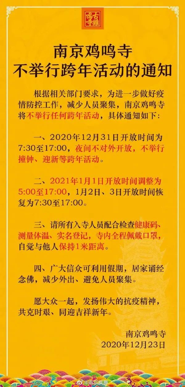 南京鸡鸣寺在相关通知中指出:根据相关部门要求,为进一步做好疫情防控工作,减少人员聚集,南京鸡鸣寺将不举行任何跨年活动。
