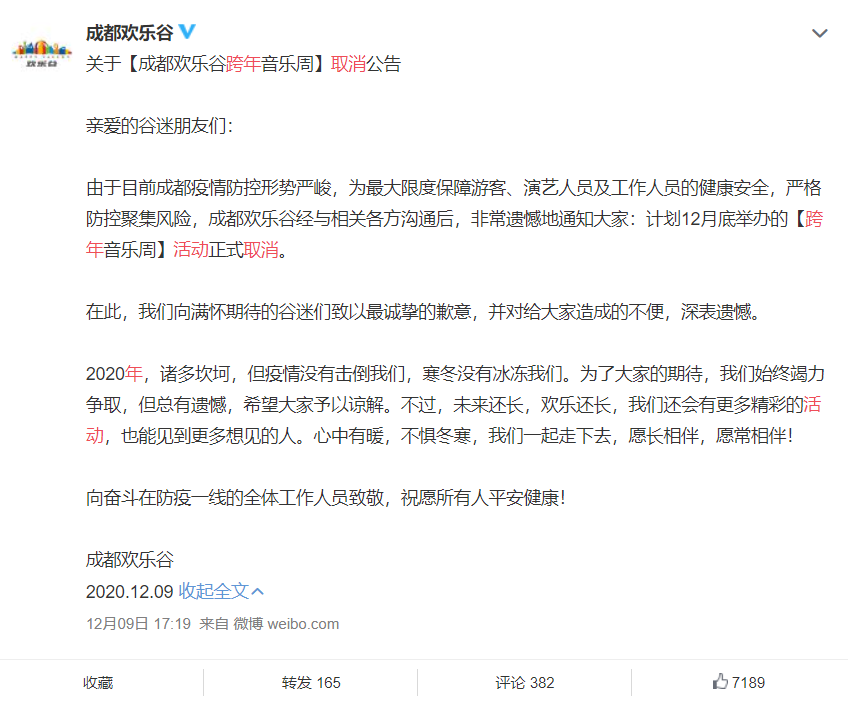 12月9日@成都欢乐谷 发布公告,由于目前成都疫情防控形势严峻,为最大限度保障游客、演艺人员及工作人员的健康安全,严格防控聚集风险,成都欢乐谷经与相关各方沟通后,非常遗憾地通知大家:计划12月底举办的跨年音乐周活动正式取消。
