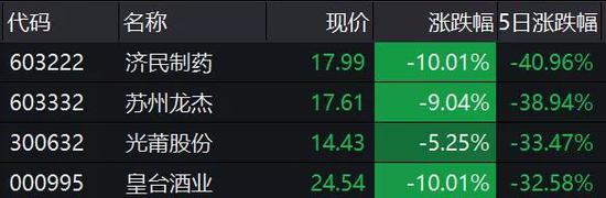 近期莫名闪崩的还包括济民制药、光莆股份、皇台酒业(维权)等。Wind数据显示,截至12月25日收盘,上述三只个股本周累计跌幅分别达到40.96%、33.47%、32.58%,位居周跌幅榜前列。