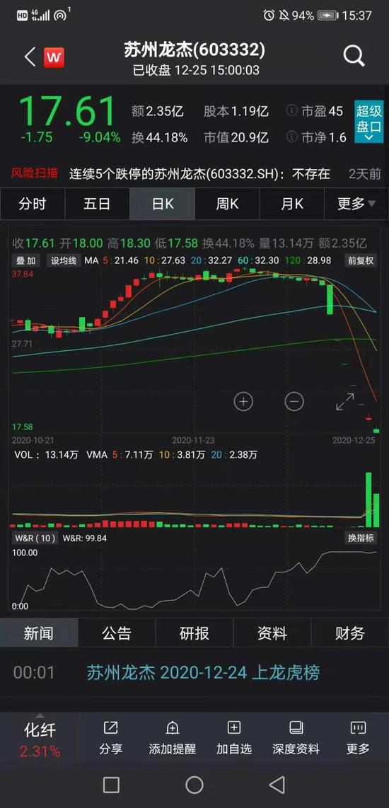 作为近期闪崩股的代表之一,苏州龙杰最近的表现不可谓不“惊人”:12月17日,公司股价突然跌停,此后连续4个交易日一字板跌停;12月24日虽然打开跌停板,但仍大跌近8%。短短7个交易日,苏州龙杰股价已腰斩,累计跌幅达50.53%。此前公司股价从4月底开始拉涨,实现50%的涨幅足足用了半年时间。
