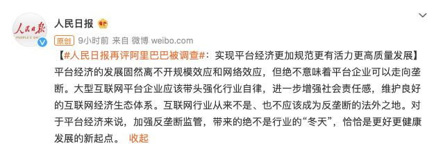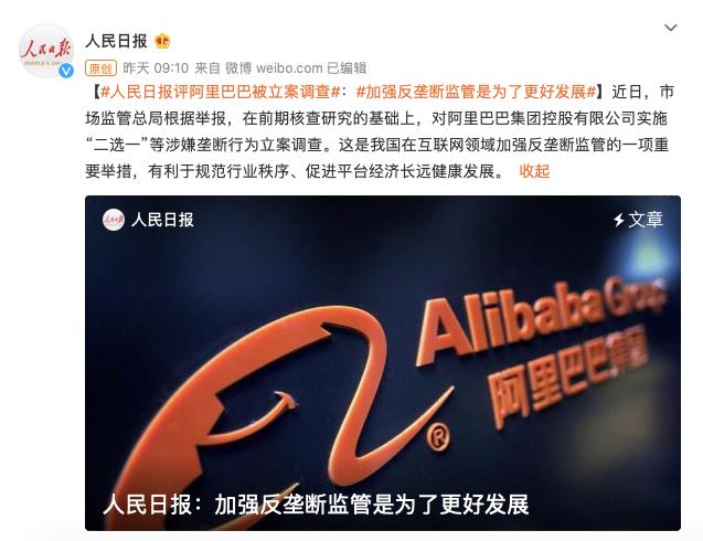 紧接着,中央会议结束不到一周(12月24日),市场监管总局发布重磅消息——近日,市场监管总局根据举报,依法对阿里巴巴集团控股有限公司实施“二选一”等涉嫌垄断行为立案调查。