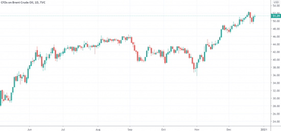 本月初,历经长达四天的“加时谈判”后,OPEC+终于宣布就减产安排达成协议。与会各方同意明年一月起略微减少限产指标50万桶/天,同时逐月召开会议评估后续的产能政策,但每月的增速不超过50万桶/日。自12月中旬以来,布伦特原油稳定站在50美元/桶上方。