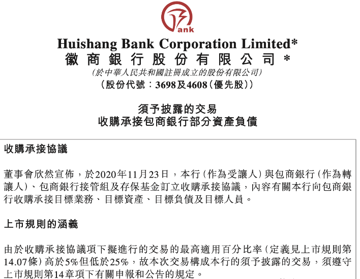 11月27日,徽商银行发布公告称,已与包商银行、包商银行接管组及存保基金于2020年11月23日签订收购承接协议,向包商银行收购承接目标业务、目标资产、目标负债及目标人员,收购价格约为177.35亿元,无需就本次收购承接向包商银行支付现金。