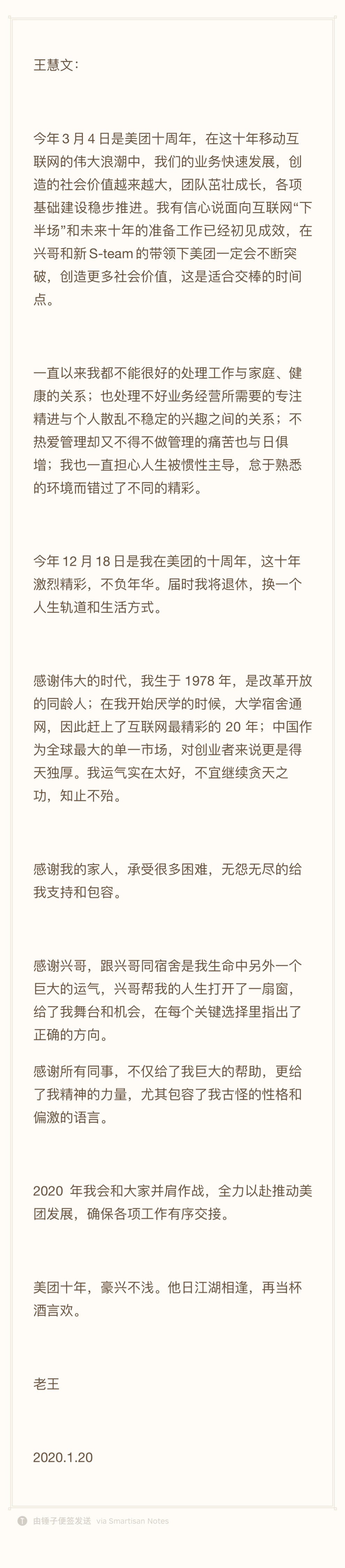2020年1月20日,美团发内部邮件,宣布王慧文将于年底退休。