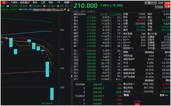 阿里巴巴港股再次重挫,收盘下跌7.98%,目前仅报210港元。上周五,阿里巴巴港股大跌8.13%。今年10月28日,阿里巴巴港股一度达到309.40元,创下上市以来新高。目前股价较高位已下跌超过30%。
