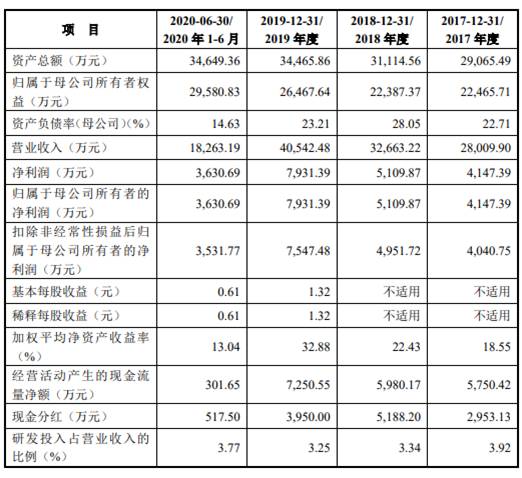 2017年至2020年上半年,公司实现净利润分别为4147.39万元、5109.87万元、7931.39万元和3630.69万元,同期公司现金分红分别为2953.13万元、5188.20万元、3950.00万元和517.50万元。