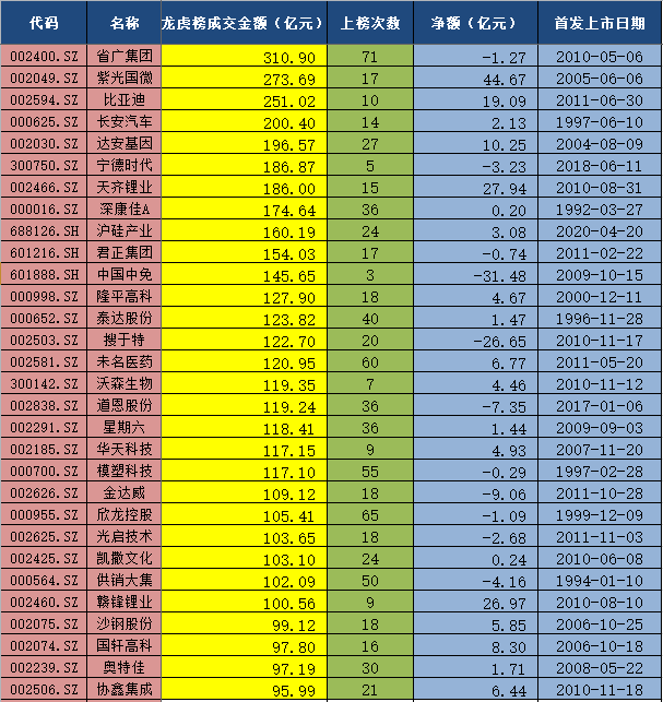 从个股交易龙虎榜来看,截至记者发稿,有4只个股的龙虎榜成交金额超200亿元,为省广集团、紫光国微、比亚迪、长安汽车,年内涨幅分别为58.68%、151.14%、275.13%、111.67%。