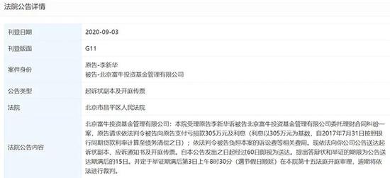 天眼查资料显示,今年9月,北京富牛投资曾遭到投资者的起诉,北京市昌平区人民法院受理原告李新华诉被告北京富牛投资基金管理有限公司委托理财合同纠纷一案,原告请求依法判令被告向原告支付亏损款305万元及利息。