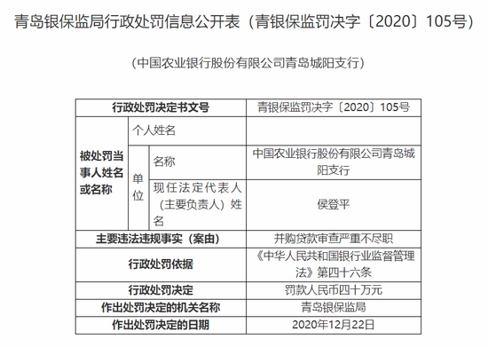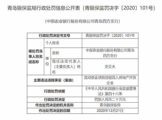 具体来看,农行青岛市南第三支行因贷款资金被挪用,被处罚款40万元;农行青岛城阳支行因并购贷款审查严重不尽职,被处罚款40万元;农行青岛高新区支行因贷款资金被挪用于归还他行贷款和缴纳土地出让金,被处罚款30万元;农行青岛四方支行因流动资金贷款违规流入房地产开发企业,被处罚款20万元。此外,四名上述违法违规行为的相关责任人一并被罚。