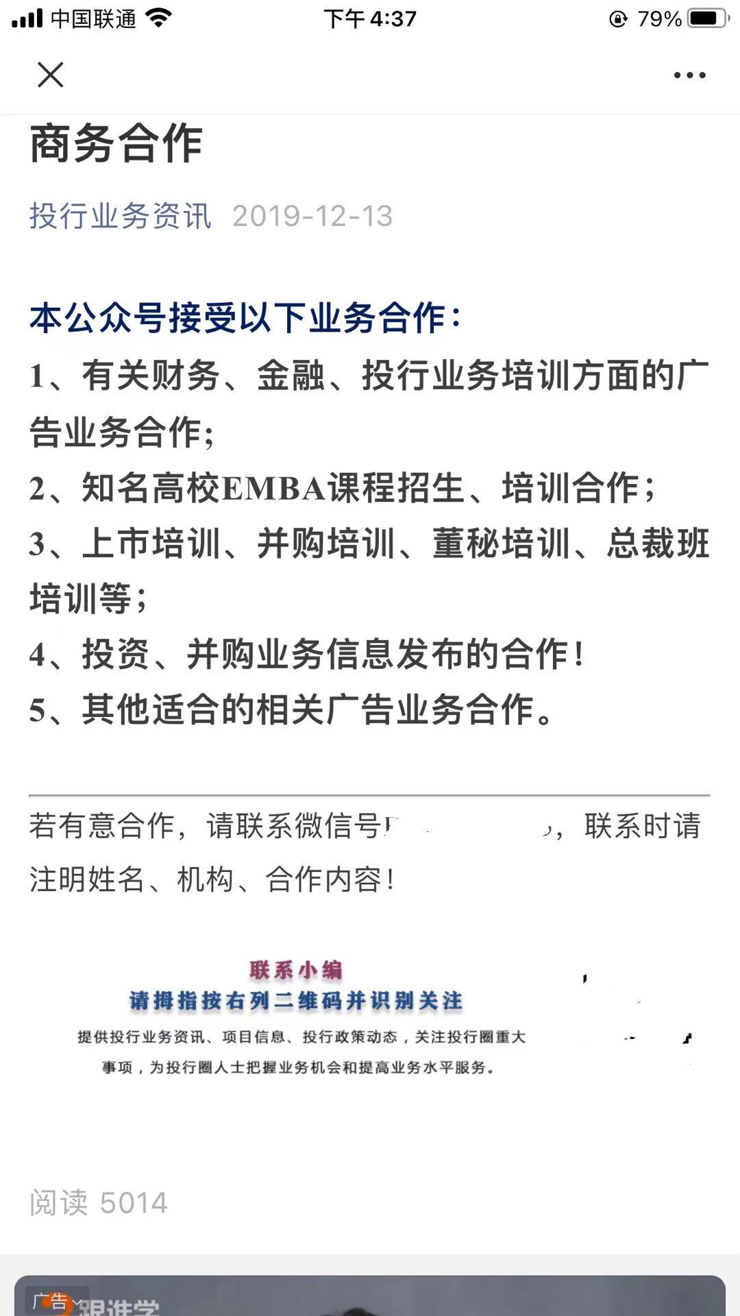 第一财经发现,名为“投行业务资讯”的公众号至今仍在正常运营,且其业务范围涵盖了“投资、并购业务信息发布”的合作。