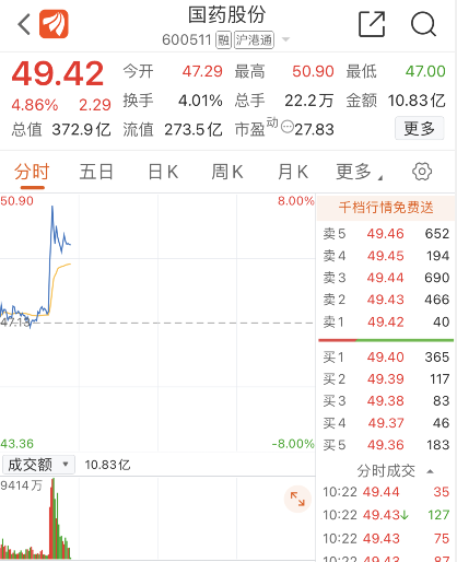 疫苗上市消息一经发布,A股国药股份瞬间拉升,现涨4.86%。概念板块内多只个股也应声大涨。