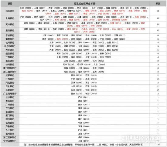 21世纪经济报道记者据银保监会信息梳理,截至目前,34家城商行共设立异地分行131家(包括徽商银行承接的4家包商银行异地分行),一级、二级分行分别为102家、29家。
