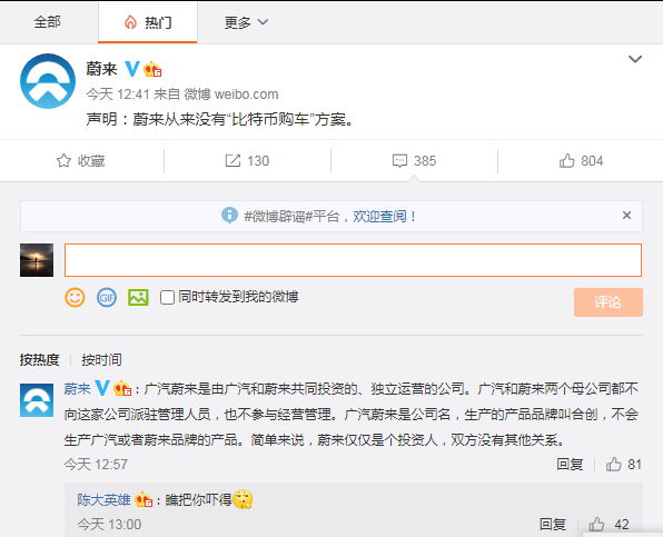 当日中午,蔚来通过官方微博平台发布声明澄清称,蔚来从来没有“比特币购车”方案。