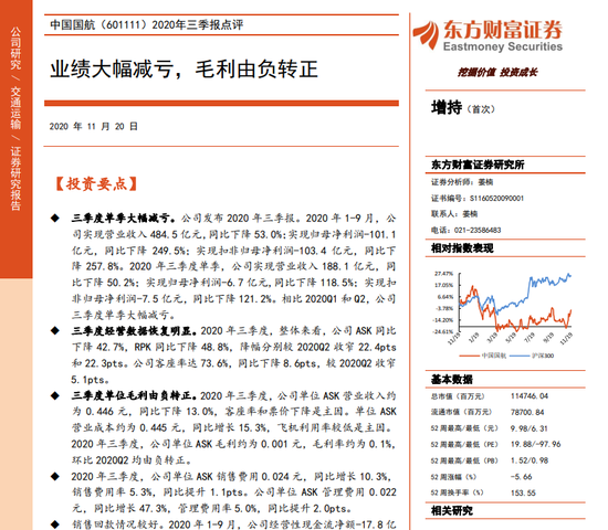 针对中国国航,东方财富证券分析师姜楠在11月下旬题为《2020年三季报点评:业绩大幅减亏,毛利由负转正》的研报中表示:“预计2020-2022年,公司营业收入分别为725.5亿元/1,219.1亿元/1,404.1亿元,同比增速分别为-46.7%/68.0%/15.2%;公司归母净利润分别为-110.2亿元/44.8亿元/79.3亿元,同比增速分别为-271.9%/140.6%/77.2%。EPS分别为-0.76元/0.31元/0.55元,对应当前股价,2021~2022年PE分别为25.7倍/14.5倍。我们短期看好随着新冠疫情逐步恢复,公司客运业务的恢复;中长期看好公司优质时刻资源的价值提升,给予‘增持’评级。”