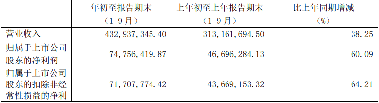 经营业绩:今年前三季度营收同比增长38.25%;归母净利润同比增长60.09%。