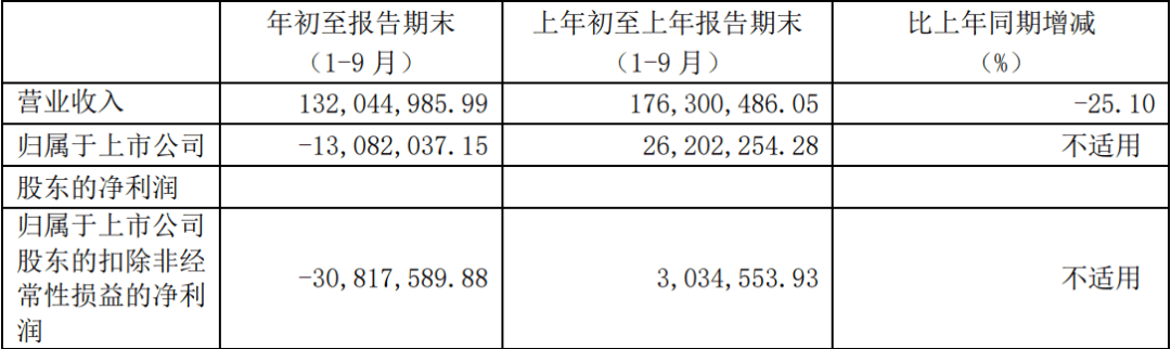 经营业绩:今年前三季度营收同比下降25.1%;归母净利润亏损1308万元。