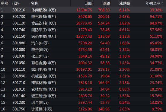 12月31日,三大指数集体上涨,申万一级行业中,仅有采掘行业小幅下跌0.21%,其他27个行业全线上涨,休闲服务、国防军工、非银金融行业涨幅居前,分别上涨6.11%、4.61%、3.34%。