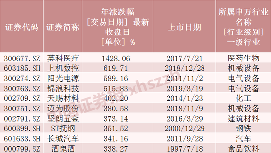 2020年A股牛股辈出,剔除年内上市新股,2020年十大牛股年涨幅的上榜门槛达到338.27%。2020年十大牛股分别为为英科医疗、上机数控、阳光电源、锦浪科技、天赐材料、迈为股份、坚朗五金、ST抚钢(维权)、长城汽车、酒鬼酒。从行业分布来看,电气设备板块有两只个股进入十大牛股行列,从市场走势来看,十大牛股在今年均持续上涨,并未出现连拉多个涨停的妖股走势。