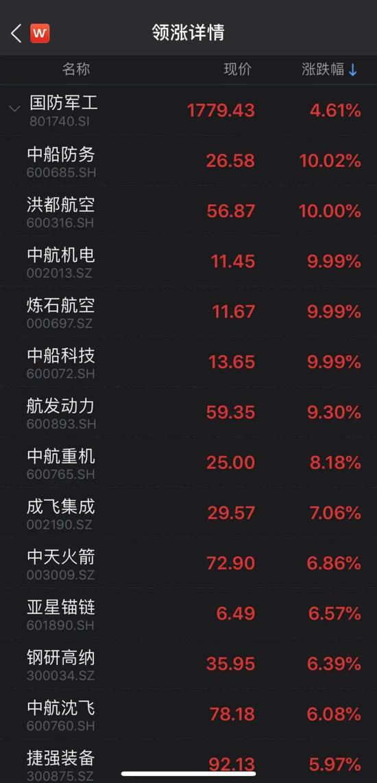 国防军工板块中,中船防务、洪都航空、中航机电、炼石航空、中船科技涨停,航发动力涨逾9%,中航重机涨8%。