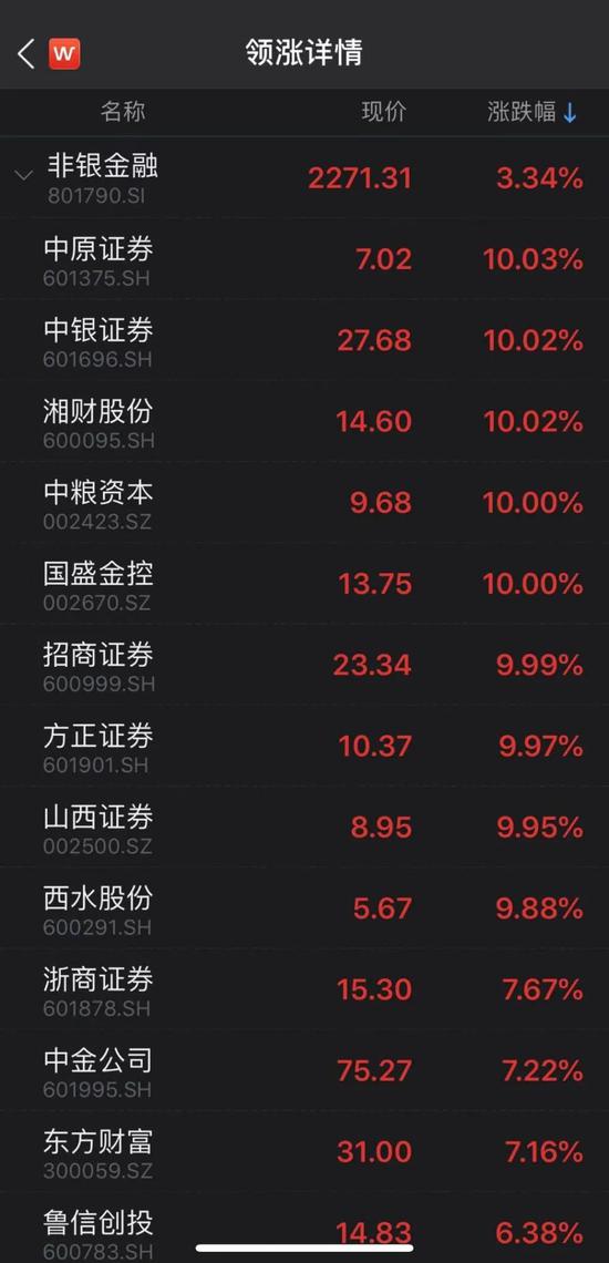 非银金融板块中,中原证券、中银证券、湘财股份、中粮资本等多股涨停,其中多数为券商股,券商股掀起涨停潮。Wind券商指数上涨4.47%。