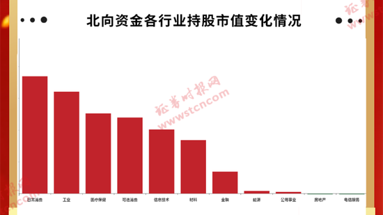 Wind数据显示,今年北上资金持有日常消费、工业、医疗保健、可选消费、信息技术等行业的持股市值增加超过1000亿元,而电信服务、房地产两大行业板块持股市值反而在下降。