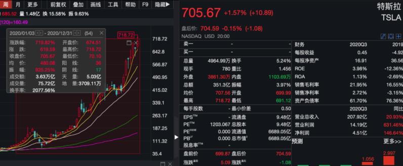当地时间2020年12月31日,特斯拉收涨1.57%,报收705.64美元,再次创下新高,全年涨幅约743%。特斯拉已经成为当之无愧的汽车板块龙头,总市值达6689亿美元,是传统车企龙头丰田的三倍有余。
