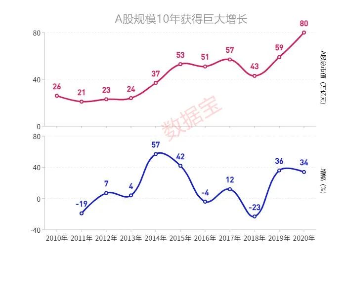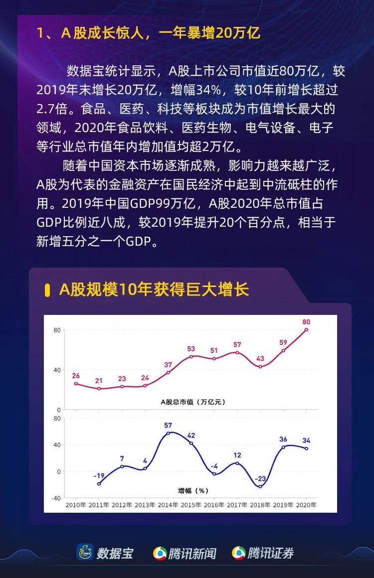 数据宝统计显示,A股上市公司市值合计近80万亿,较2019年末增长20万亿,增幅34%,较2011年末增幅超过2.7倍。食品、医药、科技成为市值增长最高的板块,2020年食品饮料、医药生物、电气设备、电子等行业总市值增加值均超过2万亿。