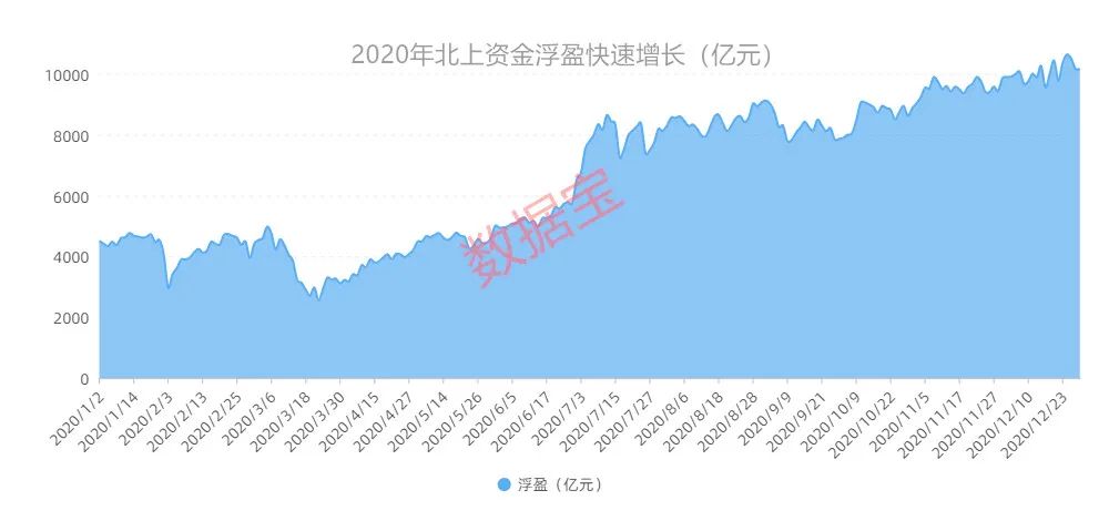 在北上资金积极投资A股的同时,收益也取得重大突破。数据宝统计显示,2020年以来,北上资金持仓浮盈快速增长,12月份终于迈过1万亿大关,相较2019年末浮盈增长超过1倍,创造了新的纪录。