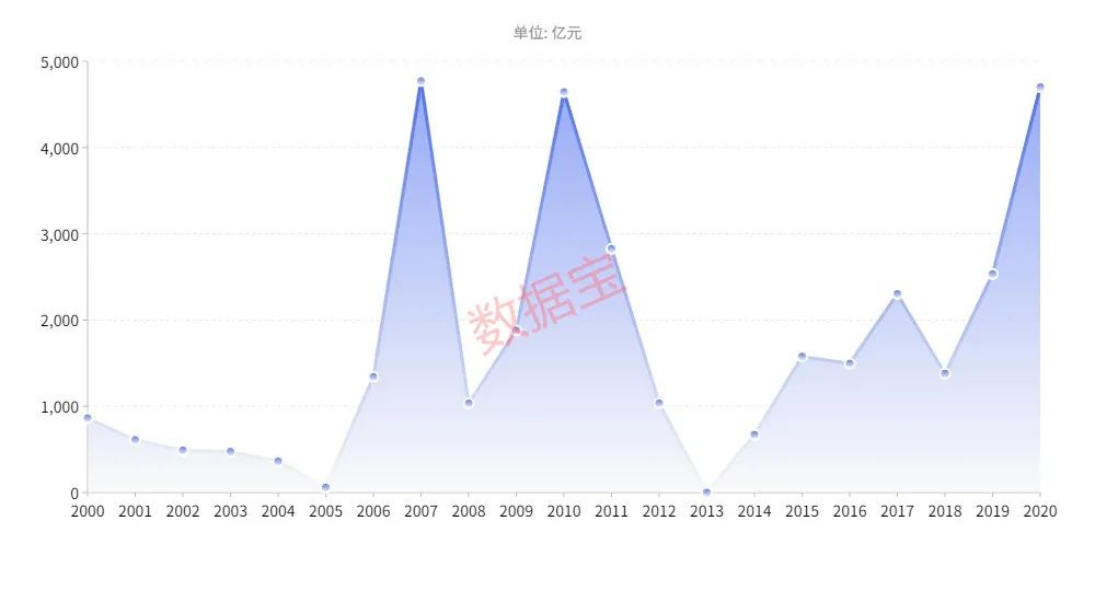 2020年A股上市新股IPO募资总额创下13年新高,为4700亿,同比2019年增长超过85.56%,IPO募资总额在历史上排在第二。数据宝统计显示,近30年来,A股年度IPO募资总额超过4000亿的仅有3次,此前两次分别为2007年和2010年,当年上市新股的IPO募资总额分别为4771亿和4643亿。