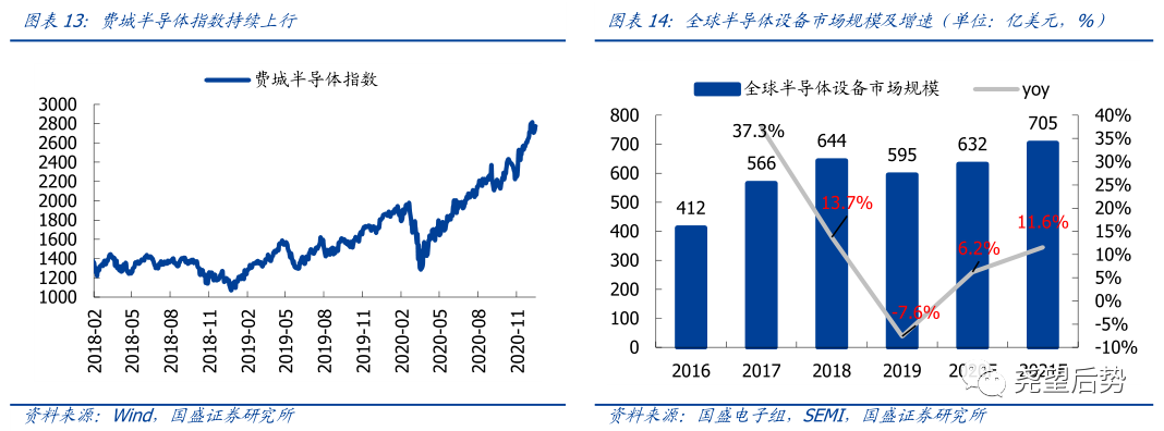 全球半导体景气度持续向上,随着疫情冲击的消退,下游需求也将快速释放。2020全球半导体资本开支开始恢复增长,根据IC Insights,VLSI,预计2020年代工Capex同比大幅增长 38%,目前存储投资已经开始全面恢复,预计2021年存储Capex同比增长约5%。另外,2021年全球半导体设备市场也有望创新高点,SEMI预计2020年全年设备市场恢复到2018年水平,2021年存储支出恢复、代工厂商扩产将拉动设备需求至705亿元新高,同比增长11.6%。