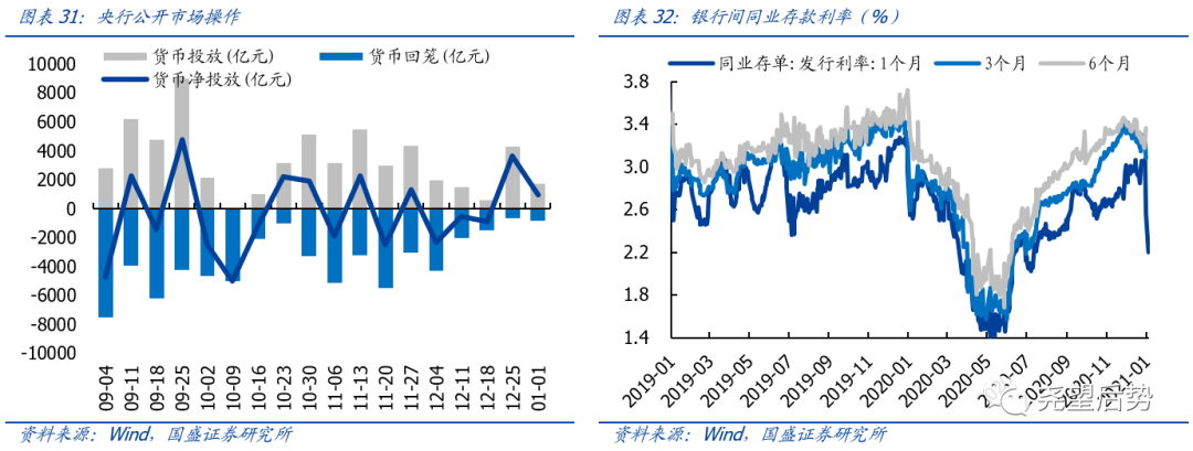 3、市场风格上,根据我们的“货币-信用”风格研判体系,将进一步转向成长方向。国盛策略团队早在2020年3月的报告《A股风格由何而定?为何未到切换时?》中,通过详细梳理不同阶段各类风格指数表现,构建了根据宏观经济、监管政策、货币-信用环境、增量资金等一系列变量判断市场风格变化的风格研判体系。并发现,货币环境与成长风格的表现高度相关,而金融周期则与信用环境高度相关。因此,随着2020年5月央行一季度货币政策报告提出“把握好政策力度、重点和节奏”强调精准投放、货币政策与经济形势相匹配确认货币政策边际转紧以来,至11月利率水平持续上行。与此同时,社融信贷增速继续回升,信用环境仍维持宽松。“紧货币+宽信用”组合下,市场风格逐步由成长风格向金融周期切换。而当前,市场货币-信用环境再度发生转向:首先,社融增速见顶,信用由松转紧、至少边际收紧的拐点逐步显现。与此同时,12月以来3个月shibor利率由3.1%持续下行至2.7%左右,货币政策出现阶段性的放松。12月29日央行四季度例会重申“稳字当头,不急转弯”,并强调稳定杠杆率,显示“宽货币+紧信用”将成为下阶段政策主基调。而根据我们的市场风格研判体系,当前货币-信用组合下,市场风格也将转向成长。