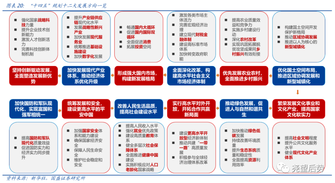 根据新的目标和新的战略,“十四五”确立十二大战区布局,明确了科技创新、产业发展、国内市场、深化改革、乡村振兴、区域发展、文化建设、绿色发展、对外开放、社会建设、安全发展、国防建设等重点领域的思路和重点工作。