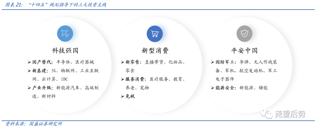 在“十四五”以国内大循环为主、国内国际双循环新发展格局指导下,结合政策力度、行业前景、增长空间等,我们梳理出三大投资主线。