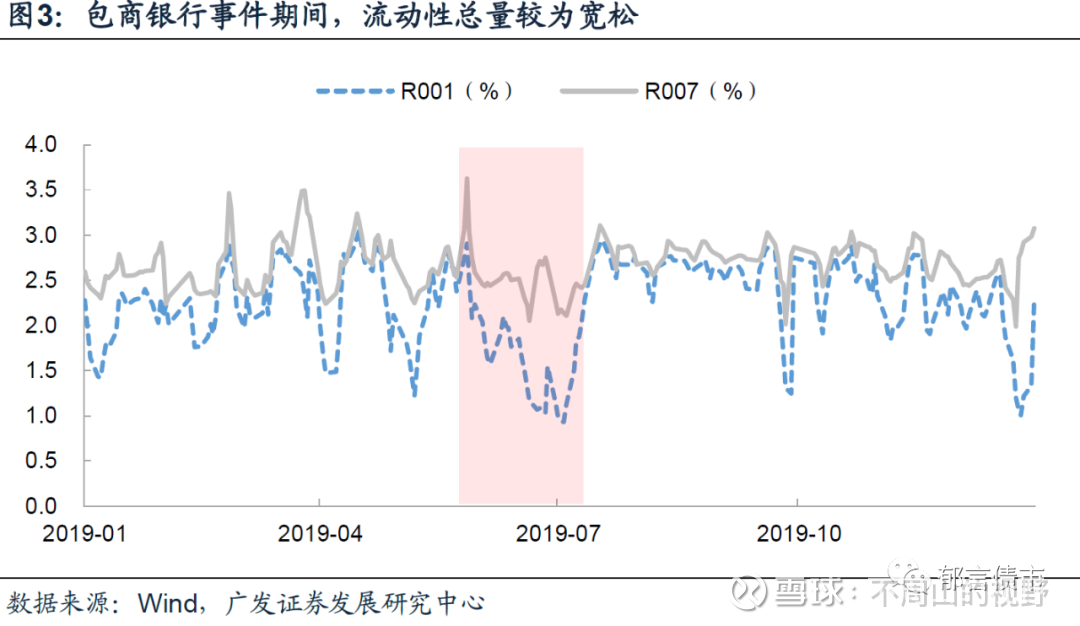 包商事件期间,央行多项举措呵护流动性,一是增加了公开市场投放总量,使流动性处于充裕状态。2019年5月28-29日,央行分别投放逆回购1500亿元和2700亿元。2019年6月13-21日税期前后,央行净投放4750亿元逆回购,远超5月税期前后的500亿元。二是提供再贴现和SLF定向支持中小银行。2019年6月14日,增加再贴现额度2000亿元和SLF(常备借贷便利)额度1000亿元。同时,对于资质较弱的中小银行,部分面临同业存单发行困难,央行提供资金,通过CRMW为其提供信用增信。在解决流动性总量和中小银行流动性支持的基础上,6月中旬,央行和证监会还鼓励大行增加对大型券商融资支持力度,大型券商传递流动性给中小非银金融机构。此举主要是提高大型券商发行短期融资券的限额,获得的资金再以市场化方式转出给中小非银机构。