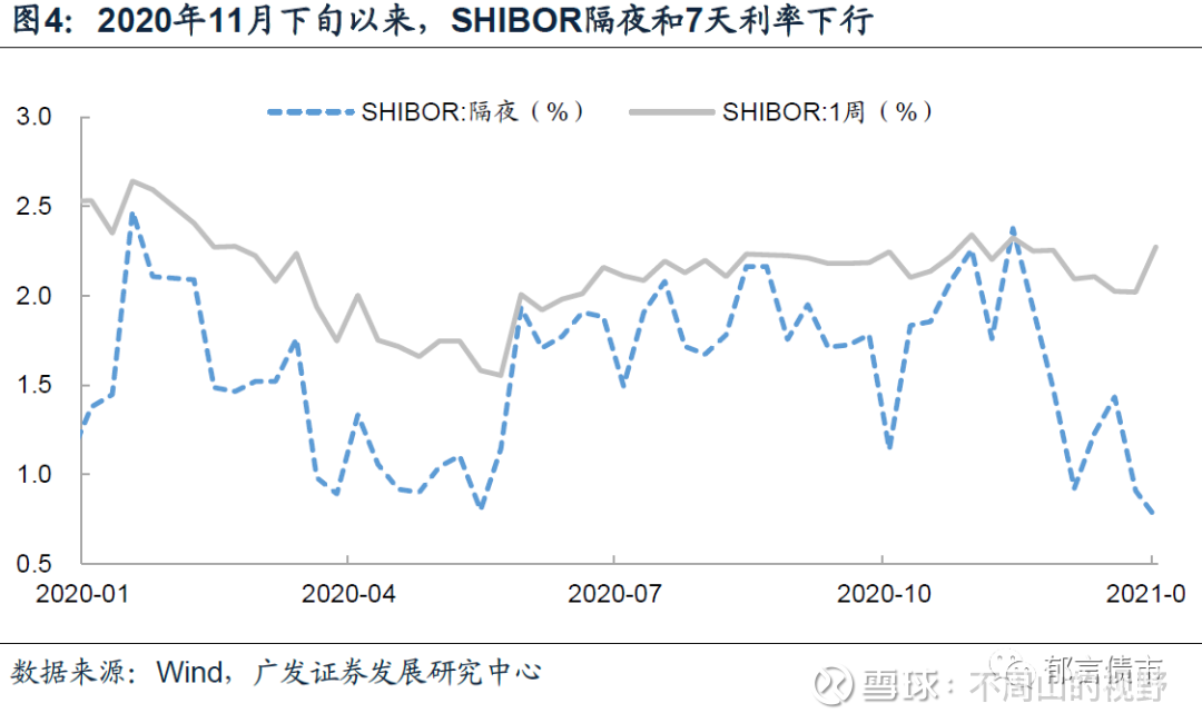 2020年11月末以来,流动性持续宽松。11月30日,央行意外投放2000亿元MLF,叠加月末财政支出资金流出,流动性明显转松。12月15日央行投放9500亿元MLF,创单次投放记录,扣除当月6000亿元MLF到期,净投放3500亿元。2020年12月最后一周,SHIBOR隔夜周度均值下行15bp至0.76%,连续七周均值位于2%以下;SHIBOR 7天也围绕2.2%附近波动。