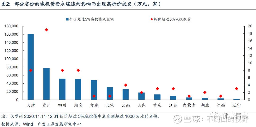 此外,也有一些省份的城投债受违约事件影响而出现高折价成交。2020年11月11日至12月31日,天津折价超过5%城投债成交额排名首位,达16.03亿元,贵州、四川、湖南和吉林折价超过5%城投债成交额在4.7-7.7亿元左右。上述省份具有债务负担较重,国企、城投非标违约等负面舆情较多或经济财政较弱的特点,永煤违约引发了投资人对地方政府偿债意愿下降的担忧,进而传导至部分城投债。
