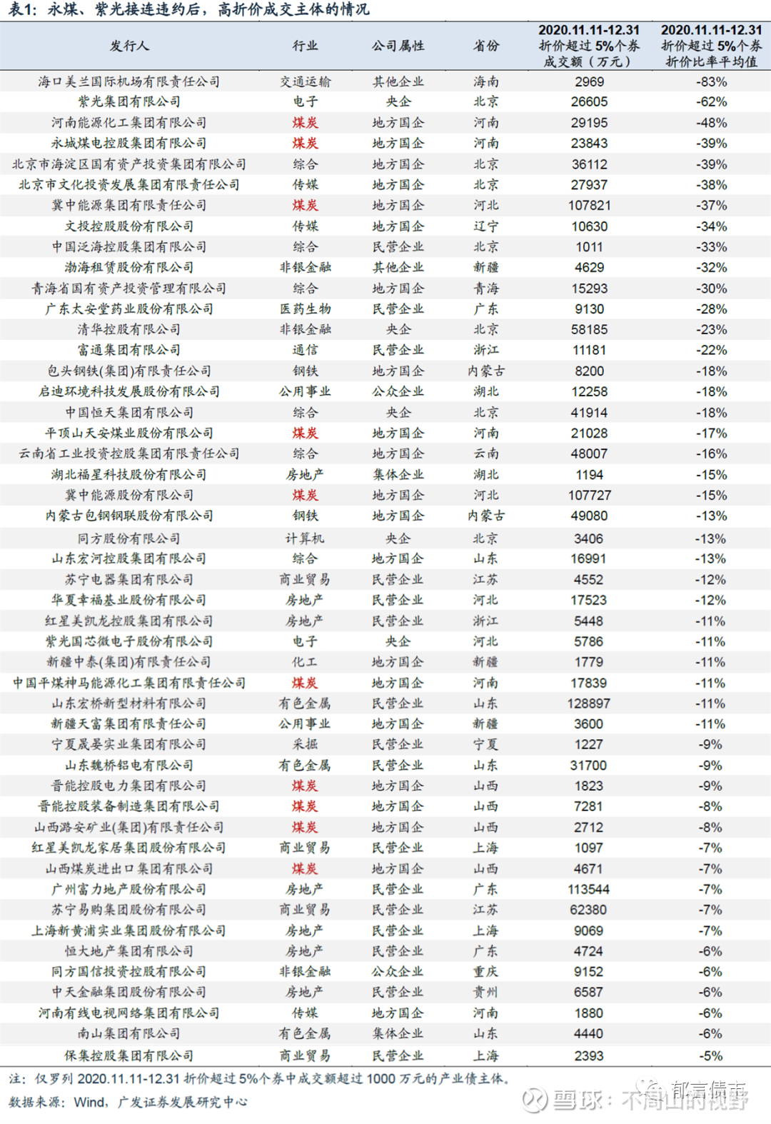 2020年11月,永煤、紫光接连违约后,高折价成交的产业债主体主要有四类,一是违约和展期主体,包括紫光集团、永煤控股、美兰机场和渤海租赁;二是违约主体的关联方,比如永煤控股的母公司豫能化,清华系的清华控股、紫光国微、启迪环境、同方股份、同方国信;三是同行业主体,尤其是煤炭行业,共有10家煤企在永煤违约后出现高折价成交,涉及河南、河北和山西煤企;四是网红主体,这类主体盈利较弱、债务压力较大且存在一些负面舆情,市场对其争议相对较大,估值波动也较大。