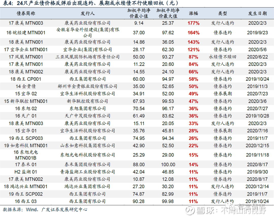 第二,高折价产业债也有所反弹,但整体风险相对较大。相比城投债,产业债的成交净价最小值整体处于更低水平、个券涨幅也更高。涨幅超过10%的55只产业债,有32只成交净价最小值低于70元,其中有16只低于50元;共有14只个券涨幅超过50%。与此同时,一些高折价产业债在价格反弹后,出现了违约和展期。其中,有14只债券之后出现违约,有7只债券的发行人出现违约,还有2只展期的债券和1只不赎回的永续债。