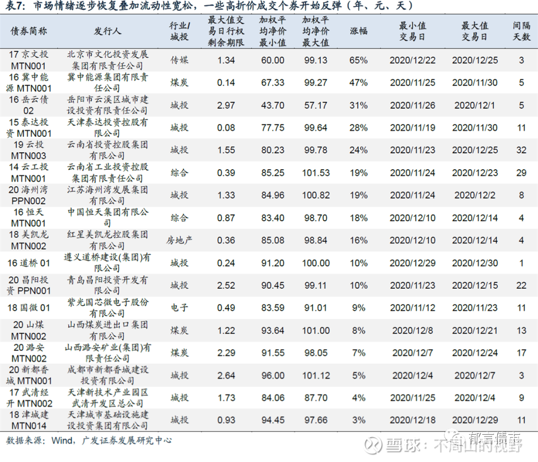 从历史上高折价成交的价格反弹来看,通常需要两个重要的外部条件,一是市场情绪的修复;二是流动性宽松。永煤违约之后,各部委、地方政府、企业层面纷纷正面表态,有助于缓解市场对于国企无序违约的恐慌情绪,从而缩短信用债市场的恢复时间。2020年11月21日,国家金融委定调,要依法严肃查处欺诈发行、虚假信息披露、恶意转移资产、挪用发行资金等各类违法违规行为,严厉处罚各种“逃废债”行为,保护投资人合法权益。
