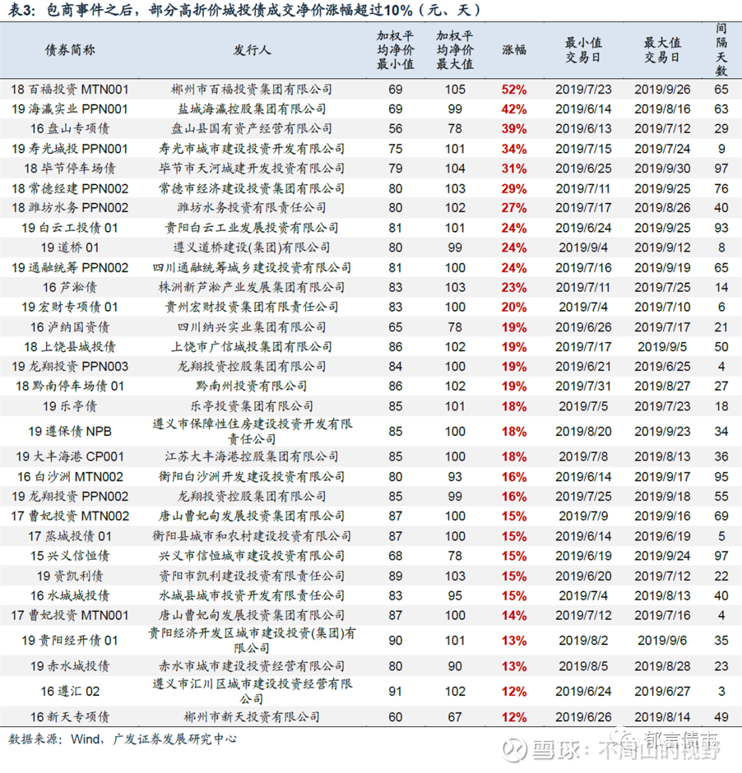 伴随着市场整体流动性宽松和非银机构流动性的疏通,高折价成交的个券也出现了反弹,部分个券反弹幅度较大。我们以2019年6-9月作为个券成交观察区间,首先筛选出现过折价超过5%的个券,并选取这些个券在2019年6-9月单日成交量超过1000万的成交明细,然后观察个券成交加权平均净价的最小值及交易日,再提取最小值之后出现的加权平均净价最大值及交易日,最后计算最大值相比最小值的涨幅及交易日之间的间隔天数。我们发现高折价个券的价格恢复,具有以下特征: