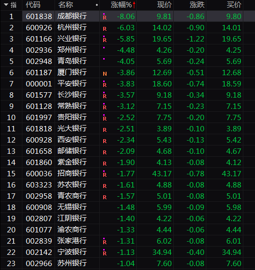 今天,整个银行群里都鸦雀无声,因为兴业、招行、平安、成都、杭州、郑州、青岛这些各位研究员的心头肉,现在全被砸懵了。总市值超过9万亿的银行股,一天市值就跌去了900亿。